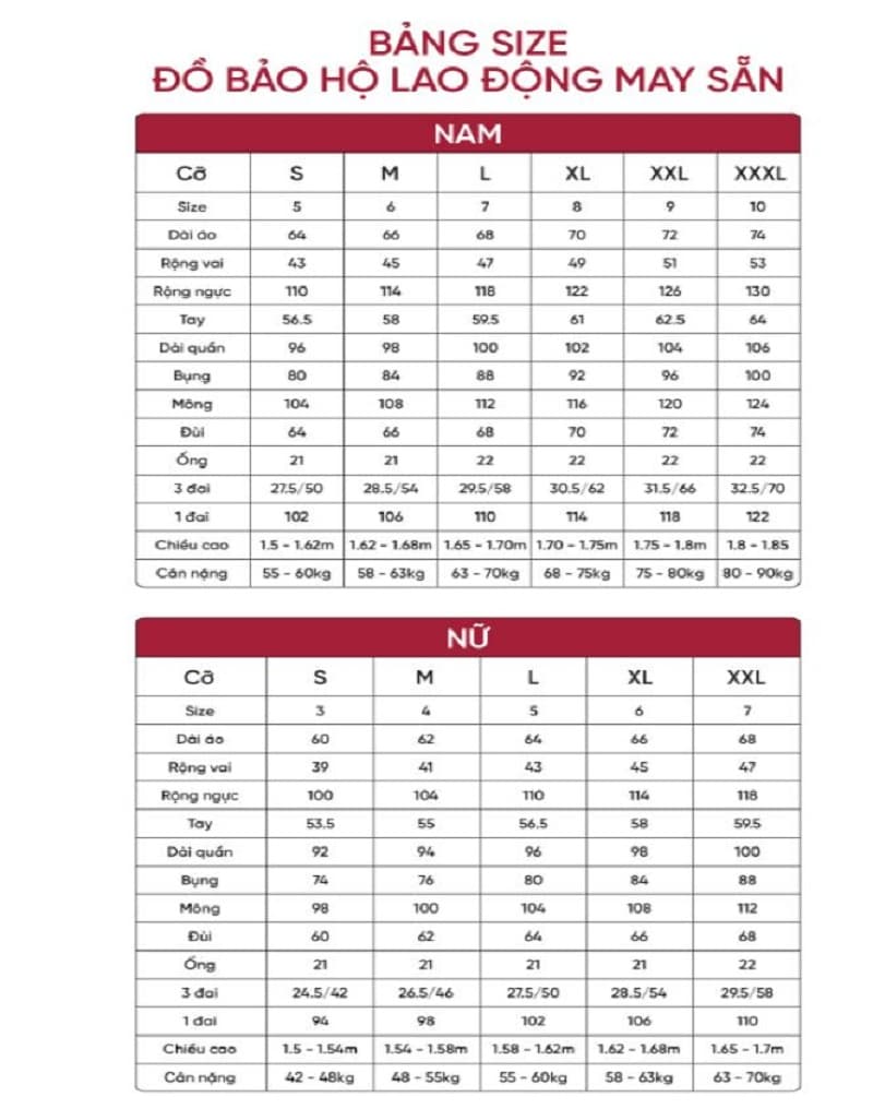 Việc lựa chọn đồng phục bảo hộ xây dựng cần chọn kích thước đúng với dáng người, đúng điều kiện công việc để mang lại sự thoải mái, tiện lợi trong quá trình làm việc. Sau đây là bảng size đồng phục bảo hộ lao động được may sẵn theo tiêu chuẩn, mời bạn đọc tham khảo: